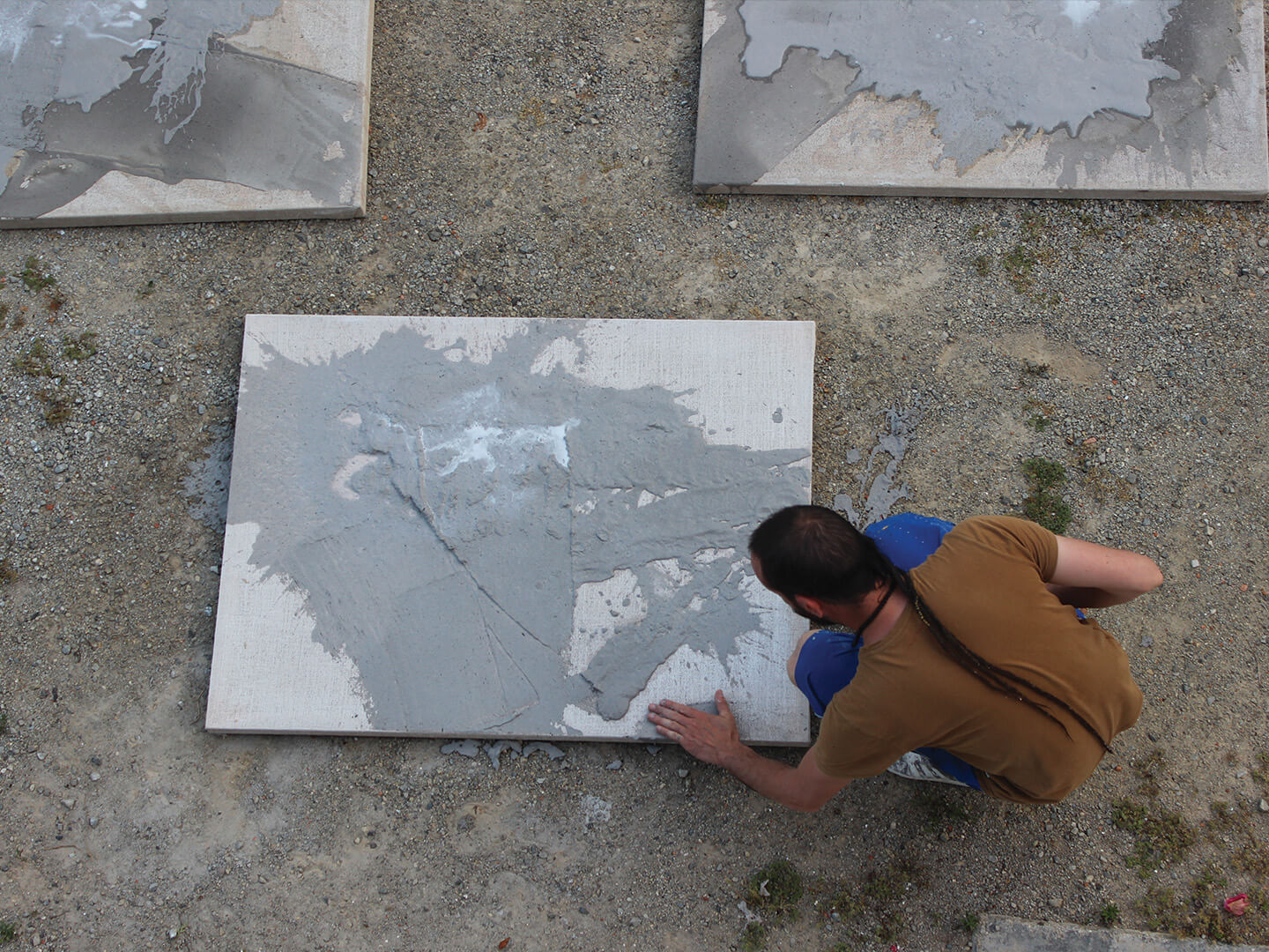 La carta viene posta a contatto con la terra creando una sorta di meccanismo simbiotico in cui le sostanze che la carta rilascia sulla terra la fertilizzano, mentre la stessa modifica l’impasto cartaceo, come per mano dell’artista.