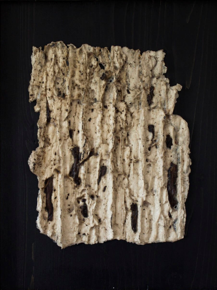 La carta viene posta a contatto con la terra creando una sorta di meccanismo simbiotico in cui le sostanze che la carta rilascia sulla terra la fertilizzano, mentre la stessa modifica l’impasto cartaceo, come per mano dell’artista.